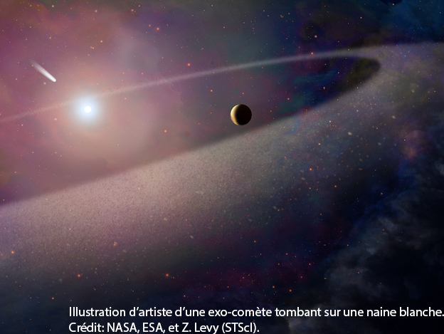 Des scientifiques ont été témoins pour la première fois de la désagrégation d’un objet de composition semblable à une comète et de son plongeon dans l’atmosphère de son étoile, une naine blanche. Ils ont déterminé que l’objet avait une composition proche de celle de la comète de Halley, mais qu’il était 100 000 fois plus massif et qu’il contenait deux fois plus d’eau que cette dernière. Cet objet était aussi riche en éléments essentiels à la vie, comme l’azote, le carbone, l’oxygène et le soufre.