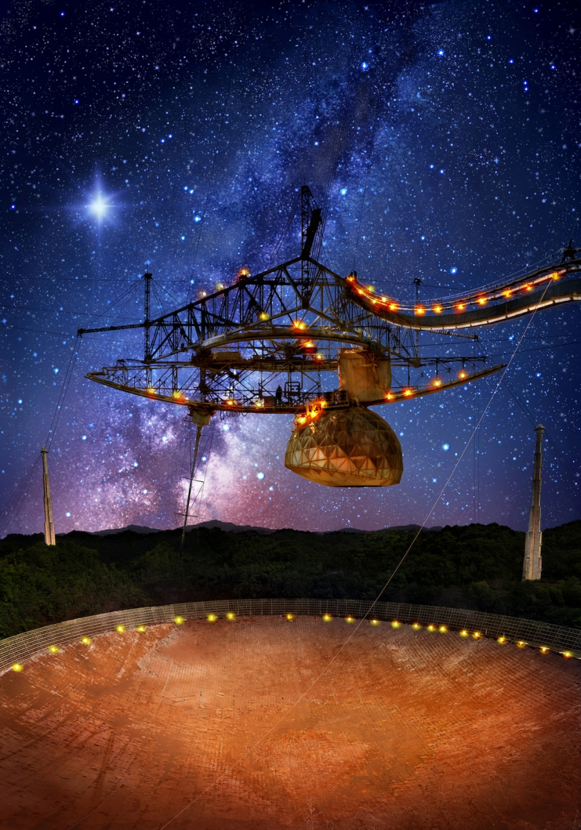 Le radiotélescope de 305 mètres d’Arecibo, à Porto Rico, ainsi que la plateforme des récepteurs radio suspendue au-dessus de l’antenne. L’éclair de la source FRB 121102 est illustrée. La source de l’éclair est émise d’une région extragalactique lointaine, au-delà de la Voie lactée. Crédits: conception de l’image: Danielle Futselaar – Photographie: Brian P. Irwin / Dennis van de Water / Shutterstock.com