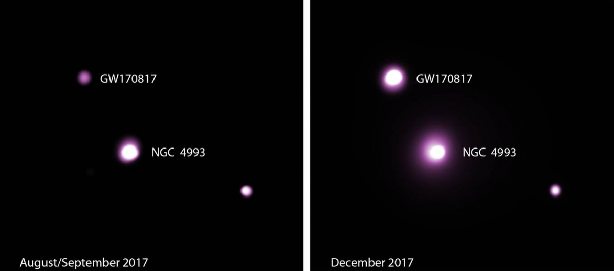 L’image montre la contrepartie de la source d’ondes gravitationnelles GW170817, produite par la fusion de deux étoiles à neutrons, dans le domaine des rayons X. À gauche, les observations du télescope Chandra obtenues en aout et septembre 2017; à droite, celles obtenues en décembre 2017. La contrepartie dans le domaine des rayons X de GW170817 est en haut et à gauche de sa galaxie hôte, NGC 4993, située à environ 130 années-lumière de la Terre. La brillance de la contrepartie X est devenue environ quatre fois plus intense en trois mois. Crédit : NASA/CXC/McGill/J.Ruan et al.