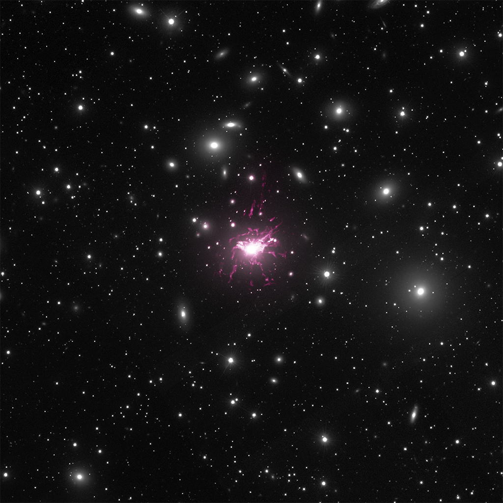 Située à 250 millions d’années-lumière de la Terre, NGC 1275 n’est pas une galaxie comme les autres. Elle se trouve au cœur de l’Amas de galaxies de Persée, un amas formé de milliers de galaxies situées dans la constellation du même nom. NGC 1275 baigne dans un gaz intra-amas chaud et diffus, dont la température moyenne est de quelques dizaines de millions de degrés – un gaz formant la majeure partie de la masse lumineuse des amas de galaxies. Cet environnement est très complexe : d’une part, le gaz chaud tend à refroidir et tomber vers la galaxie, mais d’autre part, le trou noir supermassif en son centre produit de puissants jets de particules très énergétiques, visibles dans le domaine des ondes radio et soufflant d’immense bulles dans le gaz chaud, l’empêchant de se refroidir complètement.