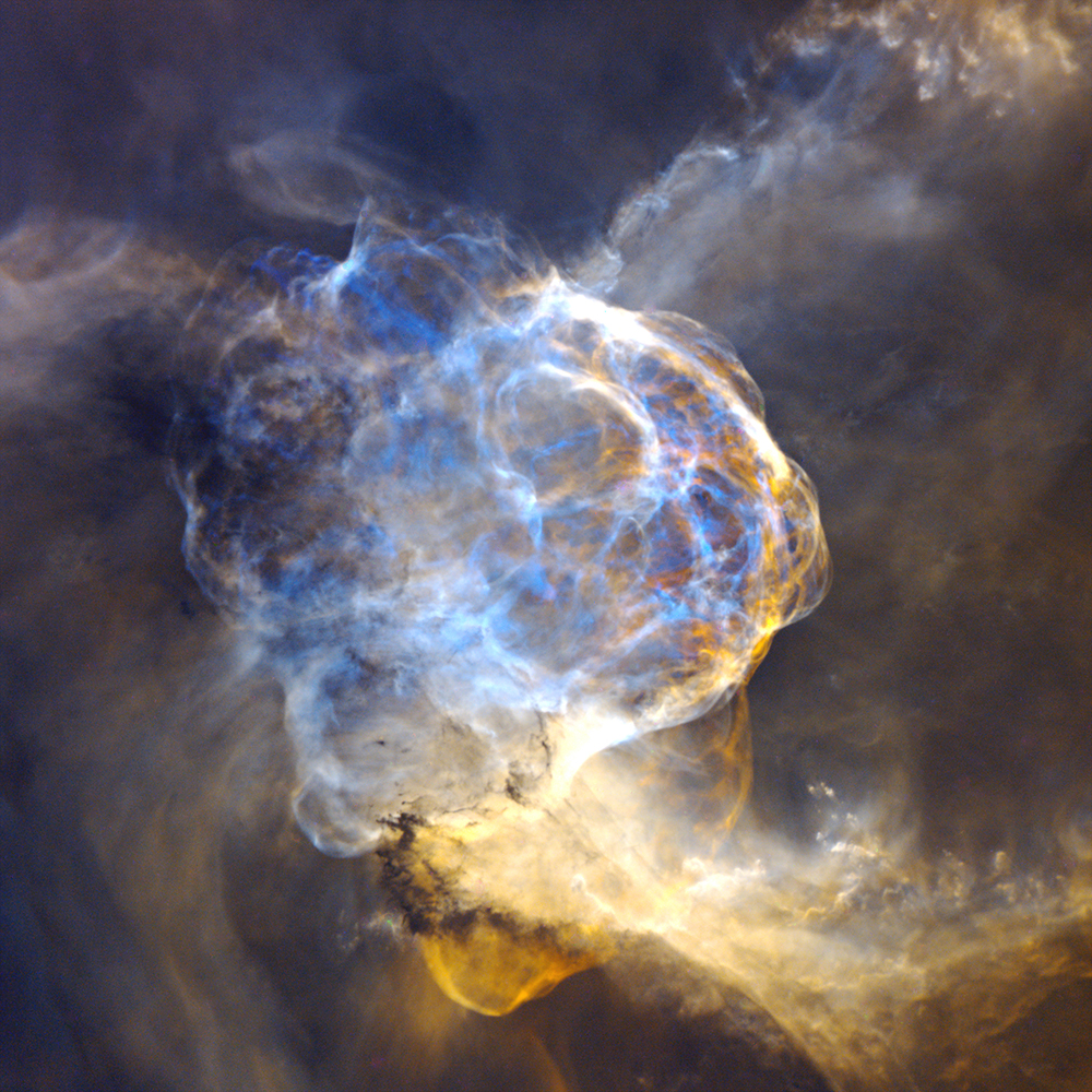 La première de ces images, intitulée Splendeurs et misères d’une supergéante, a été réalisée par les professeurs Laurent Drissen (U. Laval) et Nicole St-Louis (U. de Montréal) ainsi que le doctorant Marcel Sévigny (U. Laval). Elle illustre une gigantesque bulle de gaz au sein de laquelle se cache une étoile de type Wolf-Rayet. À la veille d’exploser en supernova, cette dernière éjecte, sous forme de vents stellaires, de phénoménales quantités de matière qui se déploient dans le nuage moléculaire environnant. Cette image Doppler montre l’expansion inexorable de cette nébuleuse, dénommée NGC 2359. Ici, seules les longueurs d’onde de la raie d’hydrogène ionisé ont été sélectionnées et les couleurs correspondent aux vitesses des gaz : du bleu, se rapprochant de nous, au rouge en direction opposée.