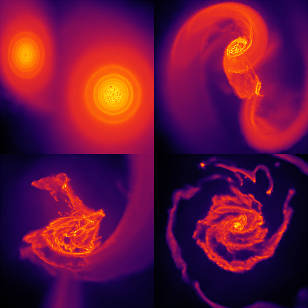 Figure 2 – Tango cosmique. Les calculs nécessaires pour produire cette simulation numérique ont été réalisés avec le code GCD+, écrit par Daisuke Kawata, tandis que les images ont été produites à l’aide du logiciel Dotty Plotty, développé par David Williamson, et du langage de programmation Python. Crédit : Amélie Dumont & Hugo Martel.