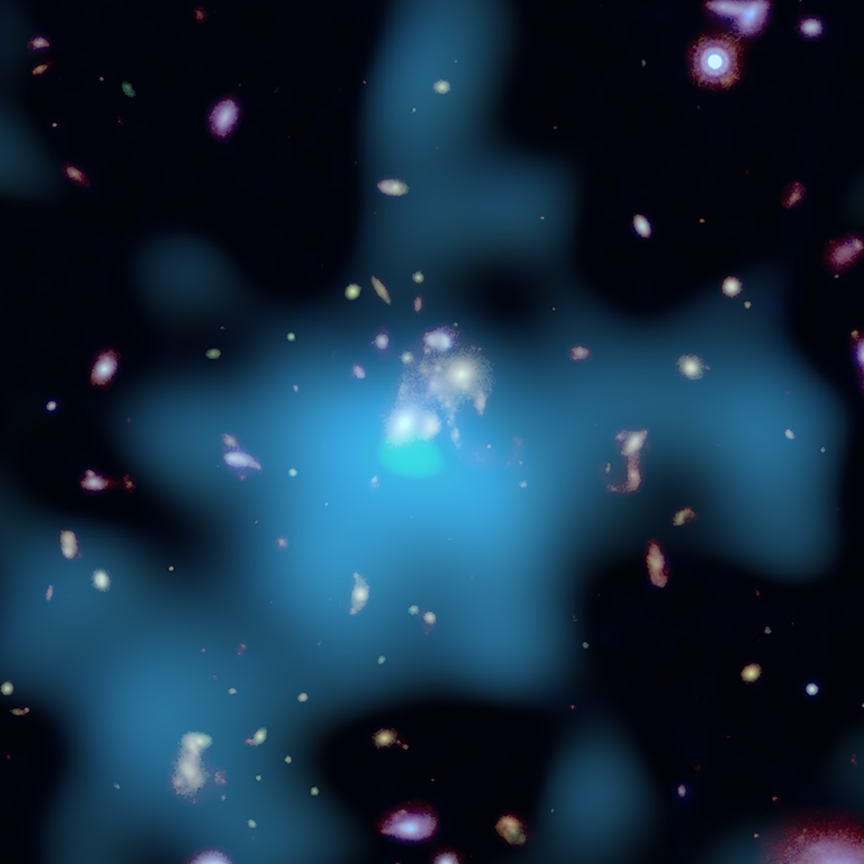 This furious star formation is happening about 80,000 light years away from the center of SpARCS1049 in a region outside any of the cluster’s galaxies. Astronomers have been asking: what is causing this prodigious cycle of star birth?