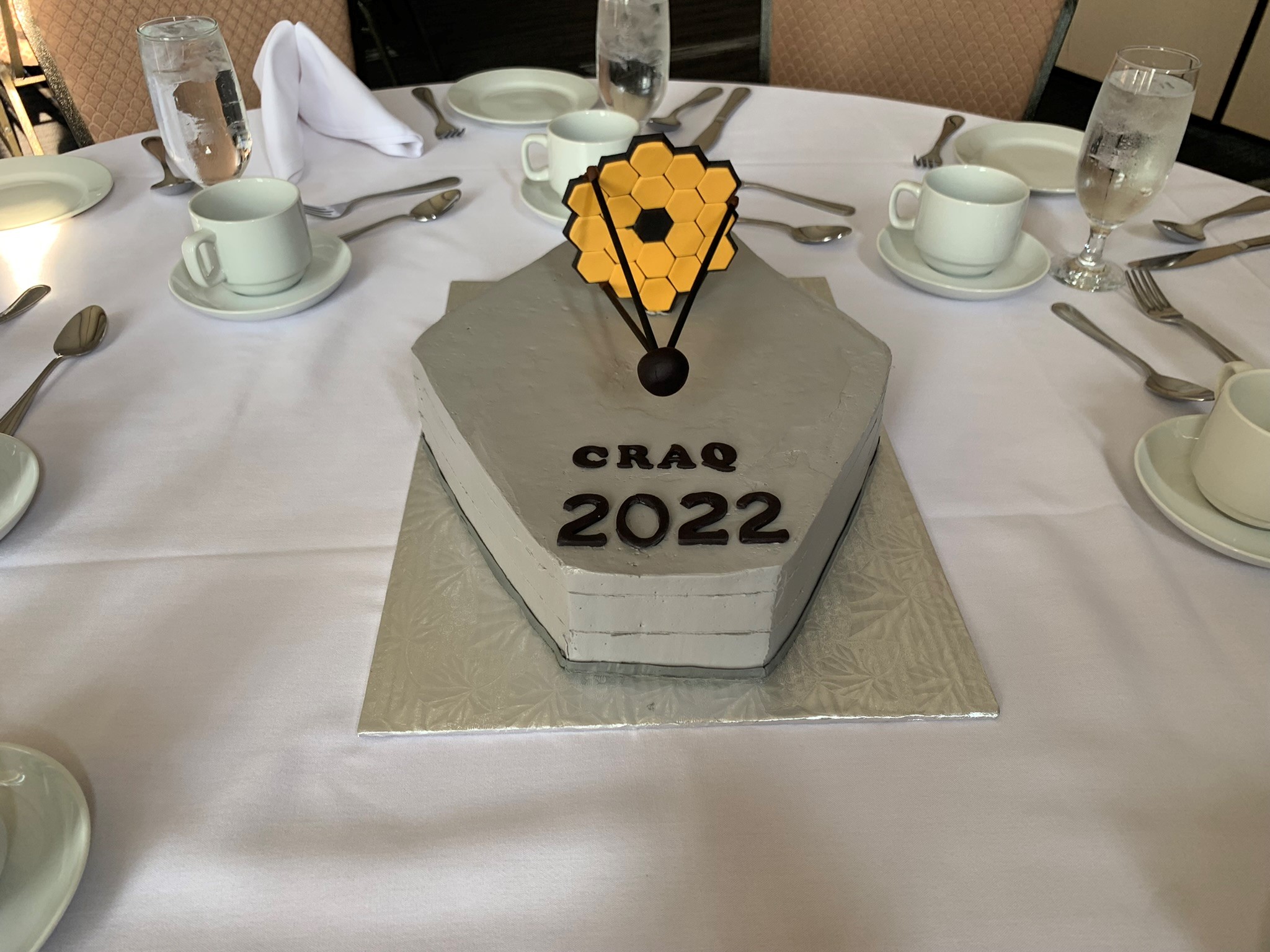 CRAQ2022_p2Bien que les journées étaient chargées, elles se terminaient sur un repas convivial permettant échanges et nouvelles rencontres. Les membres ont pu partager un gâteau ayant l’apparence du télescope spatial James-Webb récemment déployé, un projet auquel plusieurs membres du CRAQ ont apporté d’importantes contributions.